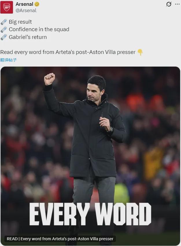 阿尔特塔出席了赛后新闻发布会,我们来看看阿森纳主帅的发言。