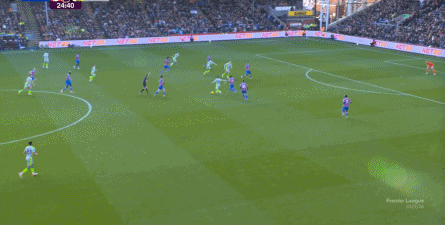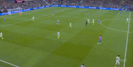 这使得水晶宫错过了他们的最好的战机窗口,因为体能问题即将找上门来,于是在此之后,水晶宫再无快速反击和进攻的机会,反倒是曼城,通过贝尔纳多-席尔瓦的牵制,暴露出了右侧禁区角的空间,找到了中场出身的努内斯,为后点的哈兰德送上了传中: